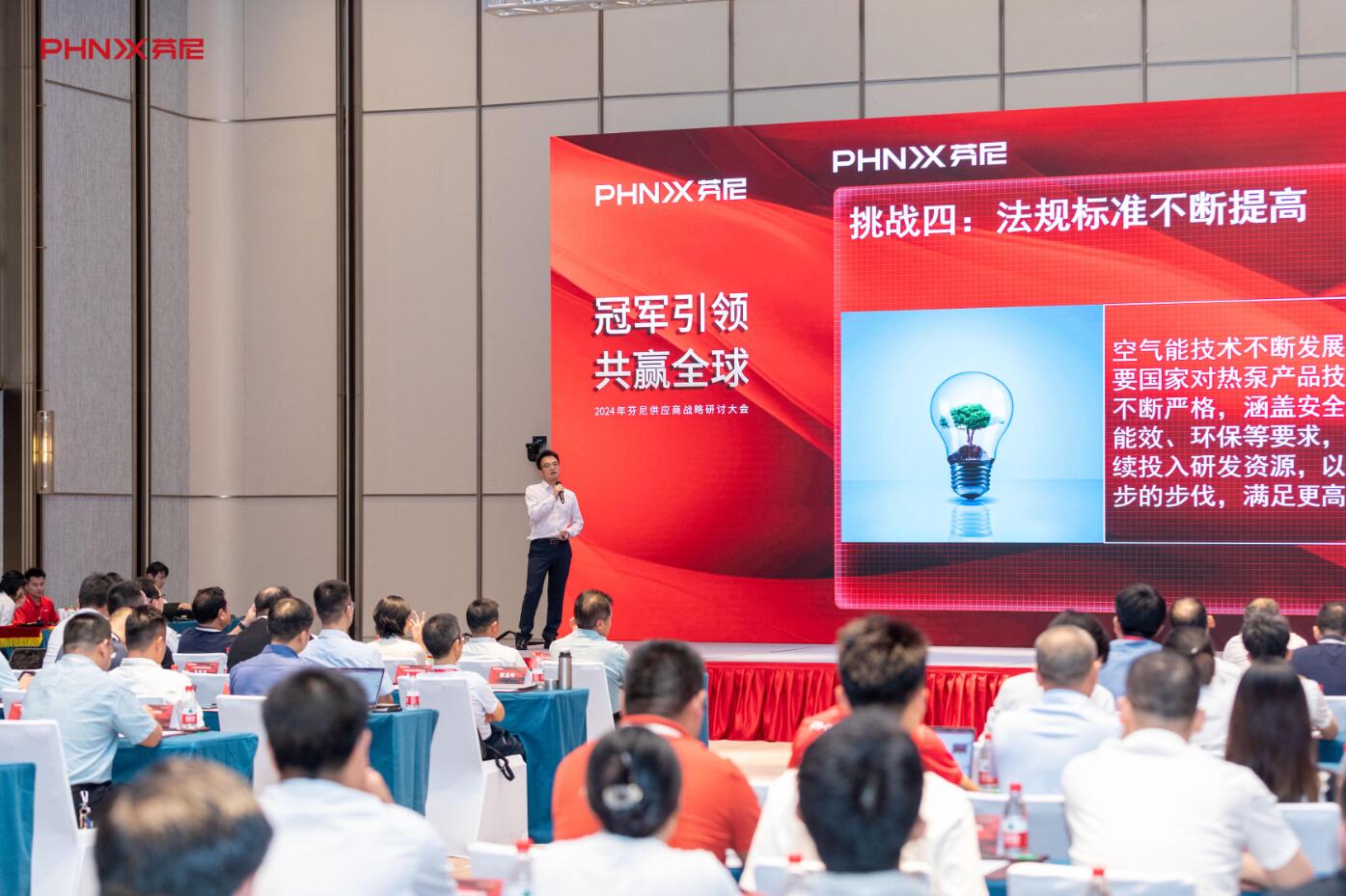 緊接著,廣東芬尼科技股份有限公司董事長宗毅上臺分享,清晰的勾勒出芬尼未來做自主品牌的全球化戰(zhàn)略藍(lán)圖, 傳遞出“冠軍引領(lǐng),共贏全球”的堅定信念,鼓勵供應(yīng)商伙伴與芬尼展開更為深入和廣泛的交流與合作,為未來打造一個互利共贏的全球供應(yīng)鏈生態(tài)系統(tǒng)奠定了堅實基礎(chǔ)。
